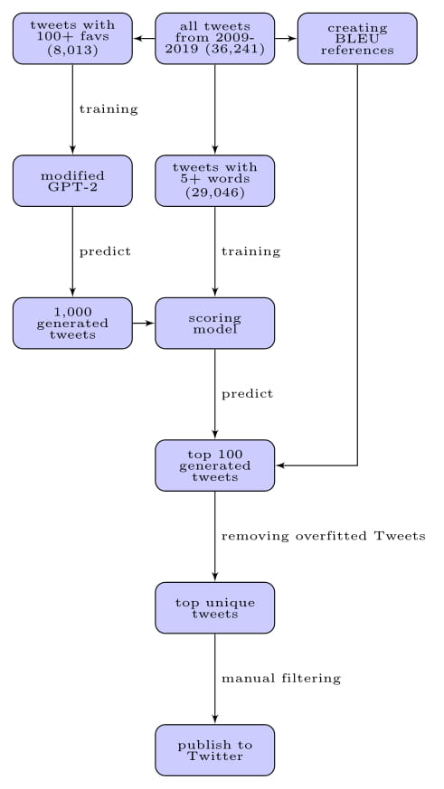 Of course, it would be very time-consuming to manually sort through the sea of output, so I built a separate scoring model (using essentially all the scraped Tweets) to classify tweets with 100+ favs. The generated tweets are fed through this scoring model, and I keep the top 100 to manually review. Finally, to remove any overfitted predictions, I compute the BLEU score of each of the 100 tweets (using the original tweets as reference), and filter out tweets who are too similar to existing tweets.