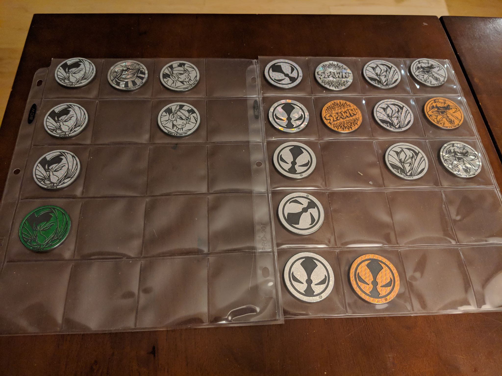 The other day I was feeling nostalgic for my Québécois childhood and, on a whim, bought 21 packs of Spawn pogs from eBay. Each pack comes with 1 kini (slammer) and 7 pogs (milk caps). To play, people take turns using a kini to slam a face-down stack of pogs, or a stack of kinis (‘kini-kini’, as the kids used to say), and win any that flip up. For this Spawn collection, there are 8 unique kinis and 70 unique pogs to collect.